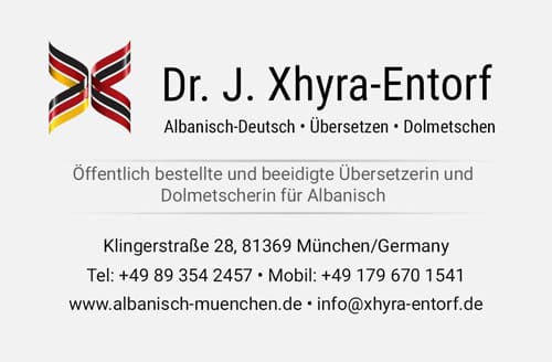Sie können mich kontaktieren unter: DR. JONIDA XHYRA-ENTORF ÖFFENTLICH BESTELLTE UND BEEIDIGTE VERHANDLUNGSDOLMETSCHERIN UND URKUNDENÜBERSETZERIN FÜR ALBANISCH UND DEUTSCH Mobil +49 (0)179 670 1541 info@xhyra-entorf.de Klingerstraße 2881369 München Festnetz +49 (0) 89 354 2457 Dr. J. Xhyra-Entorf oder benutzen Sie unser Kontaktformular: Name E-Mail-Adresse Telefon Nachricht 4 + 14 = Senden